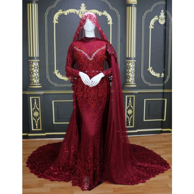 Baju gaun pengantin warna merah marun model krinolin full payet motif bunga garis garis wedding dress gown mekar muslim wanita perempuan muslimah hijab .